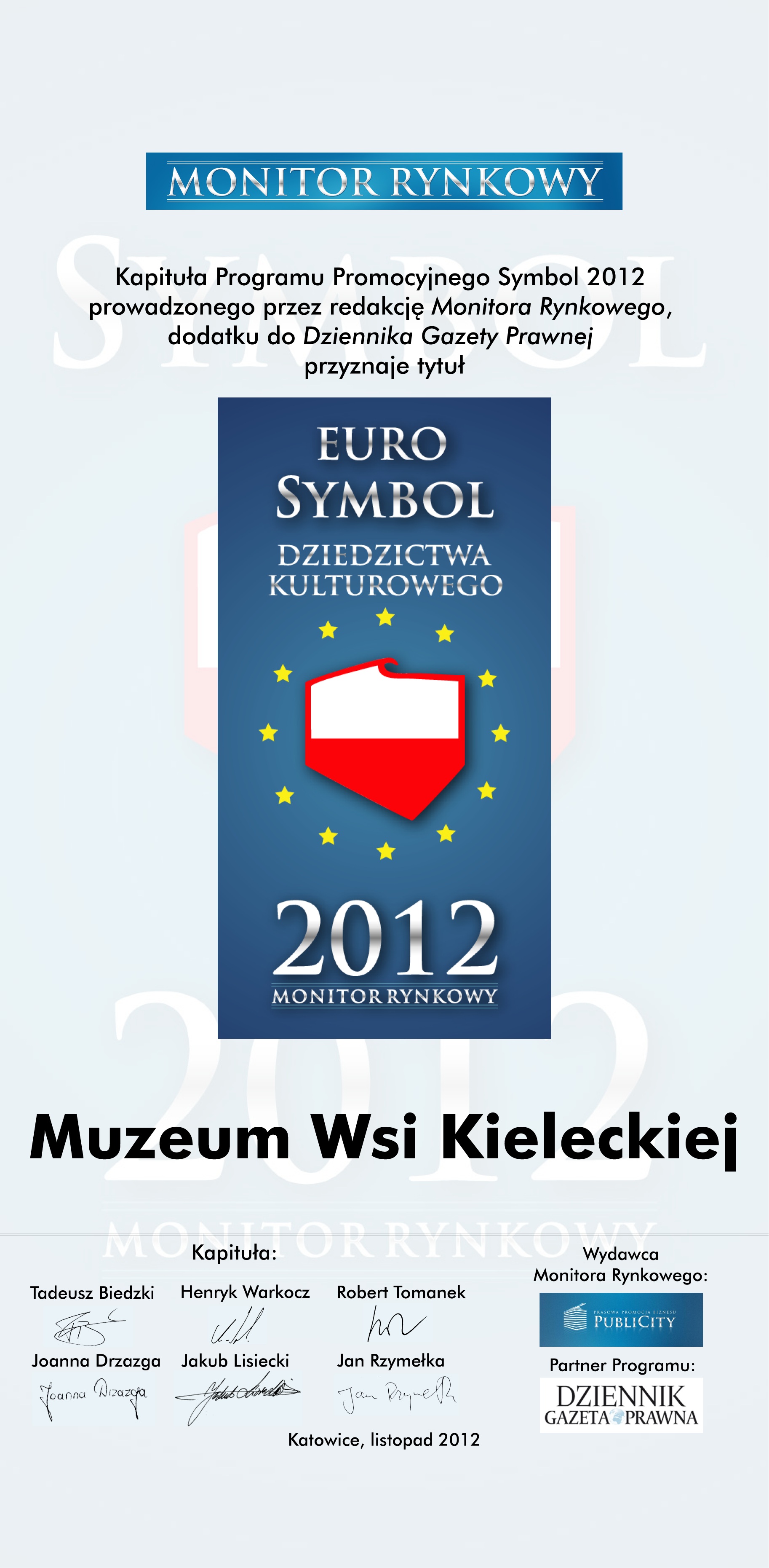 Euro-Symbol 2012 to wyróżnienie dla firm, które są motorem przemian i rozwoju w swojej branży. To wyraz docenienia ich osiągnięć na tle polskiego biznesu. Kapituła Euro-Symbolu honoruje instytucje i firmy, których marka jest reprezentatywna i tożsama z działalnością całej branży. W przypadku Muzeum Wsi Kieleckiej zostały docenione także skuteczne starania o unijne dotacje.