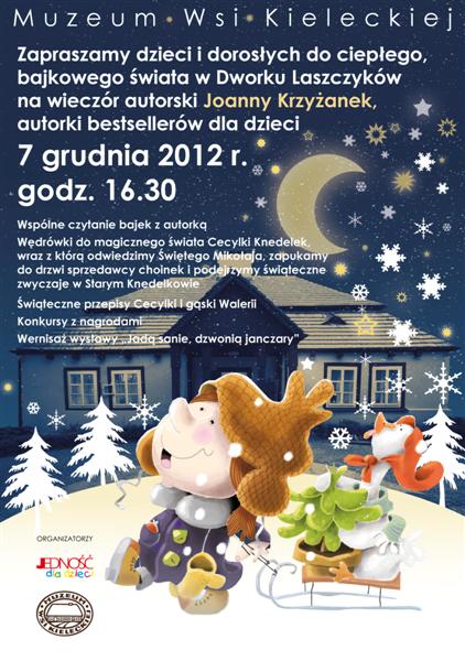 Serdecznie zapraszamy 07.12.2012 (piątek) o godz. 16.30 do ciepłego, bajkowego świata w Dworku Laszczyków, na wieczór autorski Joanny Krzyżanek, autorki bestsellerów dla dzieci.