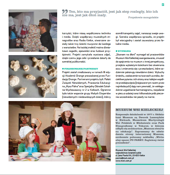 Zachęcamy do przeczytania artykułu Joanny Pelczar - koordynatora projektu "Skansen na dłoni". Tekst ukazał się w materiale pokonferencyjnym w ramach Ogólnopolskiej Giełdy Projektów "Nowe media – nowe perspektywy dla animacji kultury" organizowanej przez Narodowe Centrum Kultury, Fundację Orange oraz Fundację Rozwoju Demokracji Lokalnej.