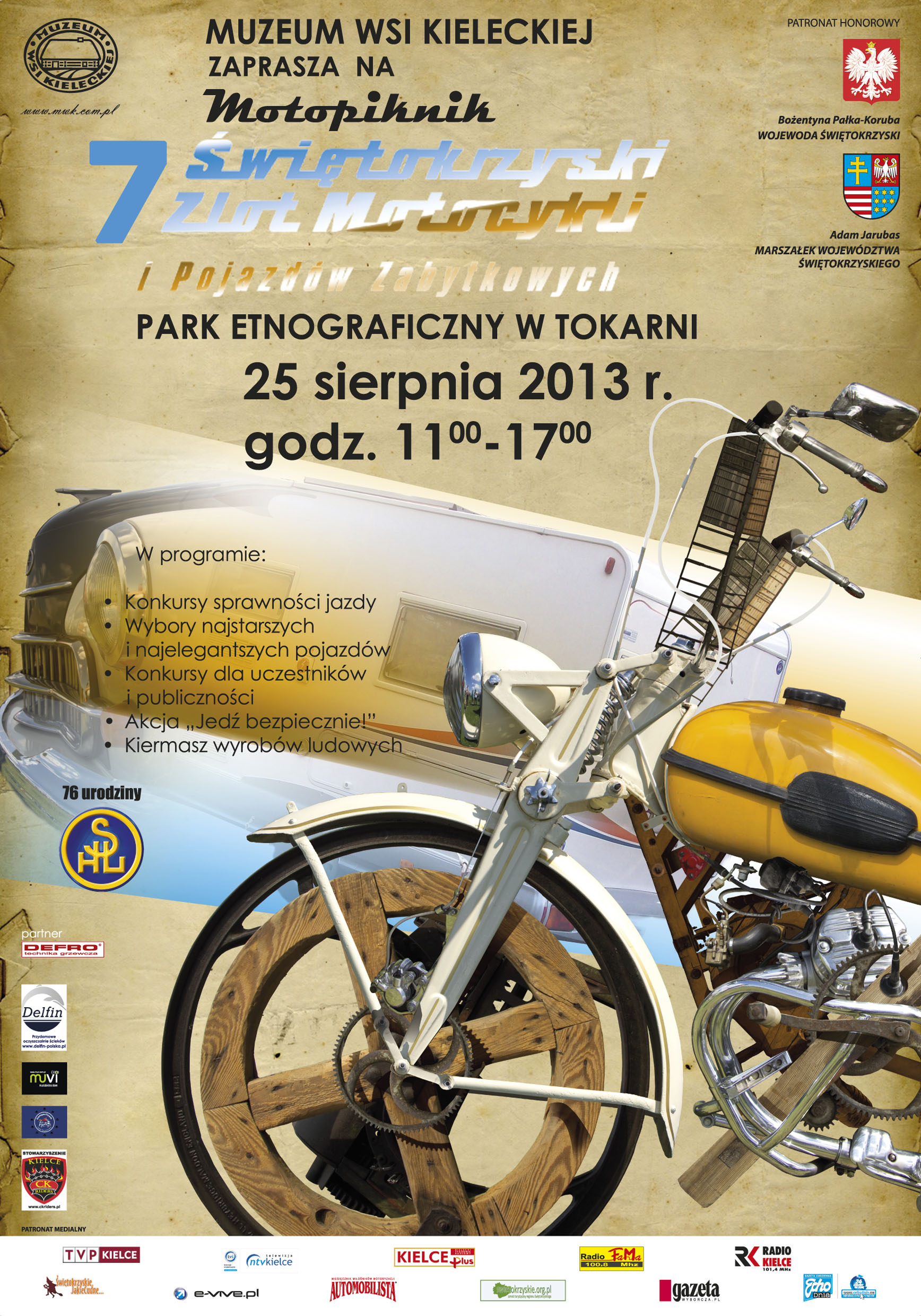 W najbliższą niedzielę, 25 sierpnia 2013 w godzinach 11.00-17.00 zapraszamy na 7 Zlot Motocykli i Pojazdów Zabytkowych. Jak co roku w skansenie zagoszczą miłośnicy motorów zrzeszeni w klubach oraz pasjonaci zabytkowych pojazdów. Uczestnicy Zlotu przejadą w uroczystej paradzie przez aleję lipową oraz wezmą udział w konkursach sprawności jazdy Odbędą się wybory najstarszych oraz najelegantszych pojazdów. Policjanci z Komendy Wojewódzkiej Policji w Kielcach będą przestrzegali przed niebezpieczeństwami czyhającymi na kierowców oraz uczyli bezpiecznych zachowań na drodze. Aktywni turyści będą mogli podziwiać kampery, które będą stacjonować już od piątku w skansenie. Na scenie zagrają zespoły z WOLNEJ STREFY. Tradycyjnie odbędzie się kiermasz wyrobów ludowych.