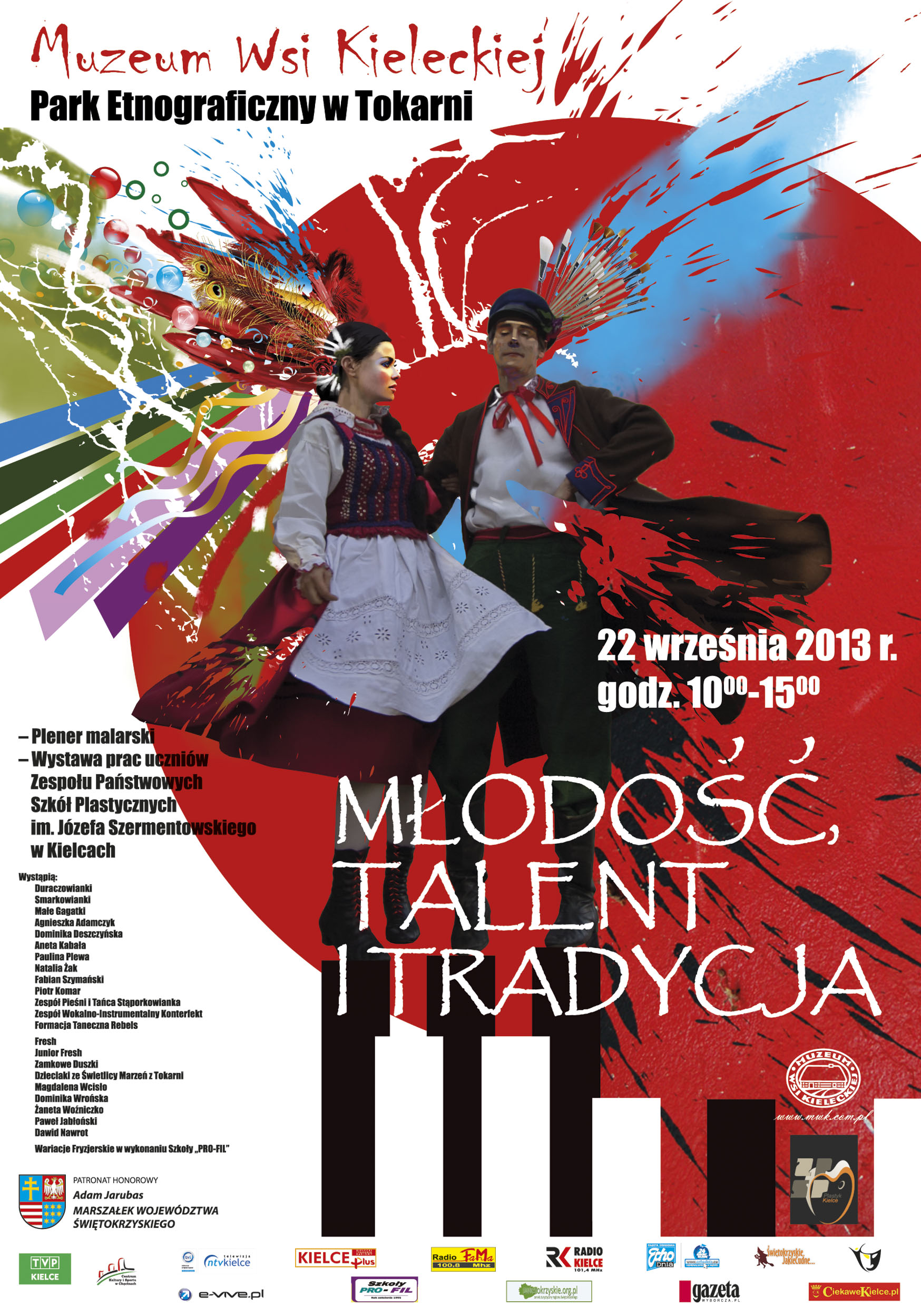 Serdecznie zapraszamy w najbliższą niedzielę 22 września 2013 r. w godz. 10.00 – 15.00 na imprezę „Młodość, Talent i Tradycja” do Parku Etnograficznego w Tokarni. To już kolejne wspólne przedsięwzięcie Muzeum Wsi Kieleckiej oraz Zespołu Szkół Plastycznych im. Józefa Szermentowskiego w Kielcach. Tego dnia w skansenie odbędzie się największy plener malarski z udziałem uczniów "Plastyka", w którym weźmie udział ok. 50 młodych artystów. W spichlerzu z Chęcin zostanie otwarta wystawa prac, przygotowana przez ZSP. Na scenie wystąpią młodzi soliści, zespoły dziecięce i młodzieżowe, a także Duraczowianki, formacja taneczna Rebels, młodzieżowy zespół wokalno-instrumentalny Konterfekt, Małe Gagatki, Zespół Pieśni i Tańca Stąporkowianka. W wariacjach fryzjerskich zaprezentują się uczniowie Szkoły PRO-FIL.