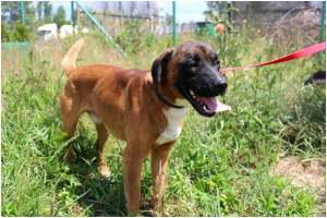 10 miesięczny psiak średniej wielkości ( około 18 kg), chodząca radość w typie boskera. Boksiowaty charakter wesołka. Pełen pozytywnej energii, chętny do zabawy zarówno z człowiekiem jak i psimi przyjaciółmi. Łagodny pies rodzinny, idealny towarzysz zabaw starszych dzieci. Uwielbia towarzystwo ludzi. Jak każdy młody pies potrzebuje pewnej dawki ruchu, aby spożytkować energię aczkolwiek nie jest nadmiernie aktywny. Pojętny, szybko się uczy. Jest zaszczepiony, odrobaczony, wykastrowany i znakowany.