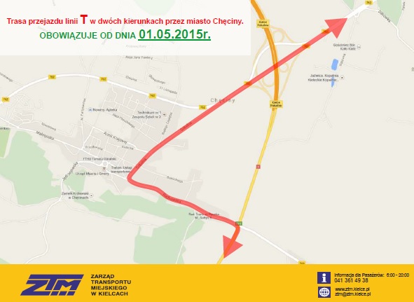 Zarząd Transportu Miejskiego w Kielcach informuje, że w dniach 01-03.05.2015r. (oraz w każdą kolejną niedzielę) uruchamia się kursowanie linii T na trasie: