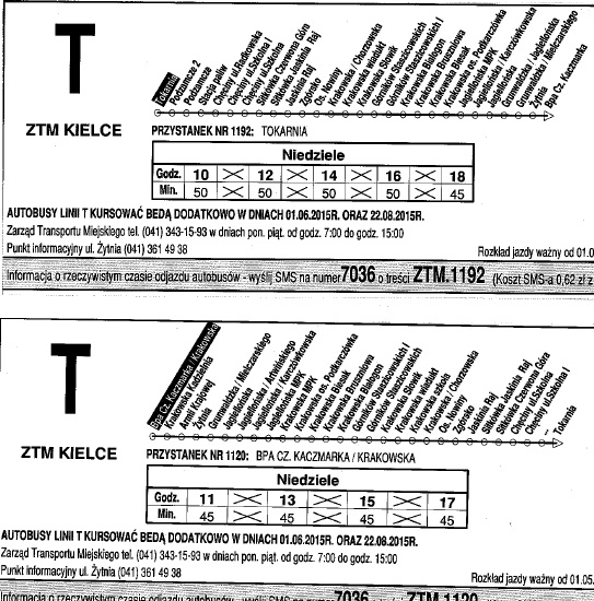 Dodatkowo autobusy linii T kursować będą w dniach: 01.06.2015r. (poniedziałek) oraz 22.08.2015r.(sobota).