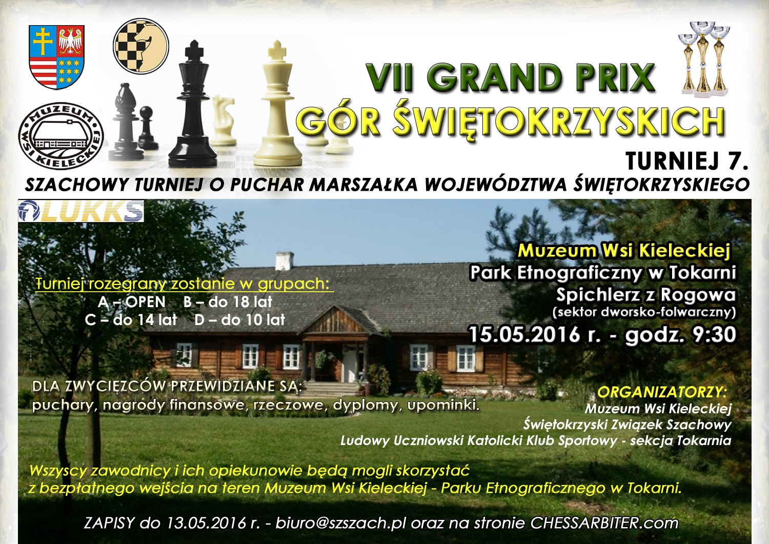 Zapraszamy wszystkich szachistów i miłośników królewskiej gry do wzięcia udziału w Turnieju Szachowym o Puchar Marszałka Województwa Świętokrzyskiego, który odbędzie się w dniu 15 maja 2016r. na terenie Muzeum Wsi Kieleckiej - Parku Etnograficznego w Tokarni.