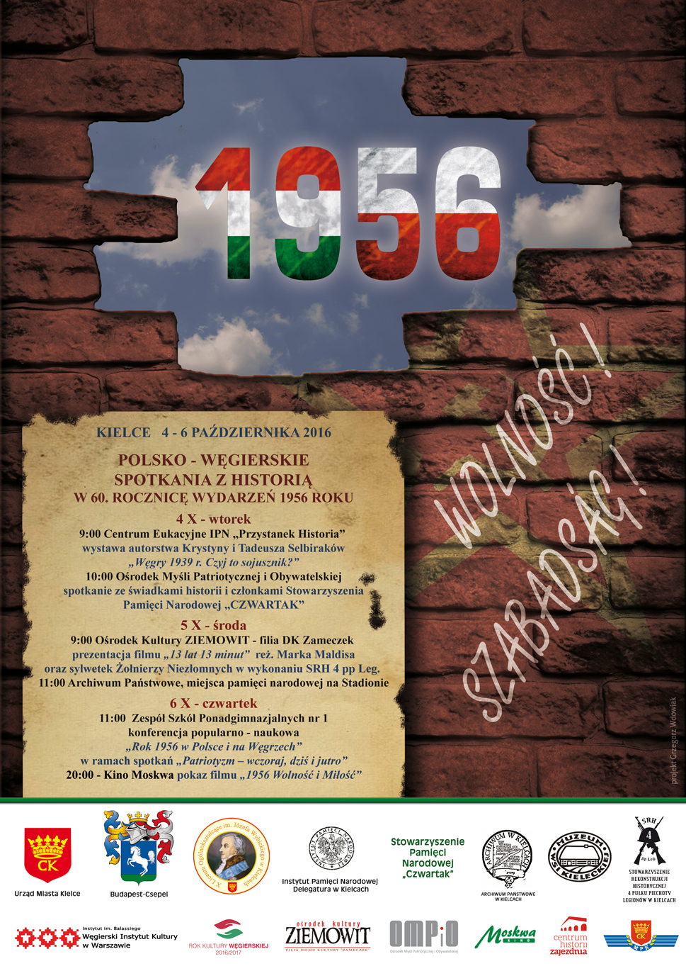 W dniach 3 - 6 października 2016 r. w Kielcach – z okazji 60.rocznicy Wydarzeń 1956 roku w Kielcach – odbędą się Polsko Węgierskie Spotkania z Historią.