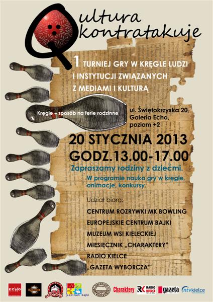 Kręgielnia MKBowling przeżyła w niedzielę istne oblężenie kultury. Na torach stawiły się drużyny Europejskiego Centrum Bajki, Radia Kielce, Muzeum Wsi Kieleckiej, Gazety Wyborczej, Miesięcznika "Charaktery" oraz Wojewódzkiego Domu Kultury.