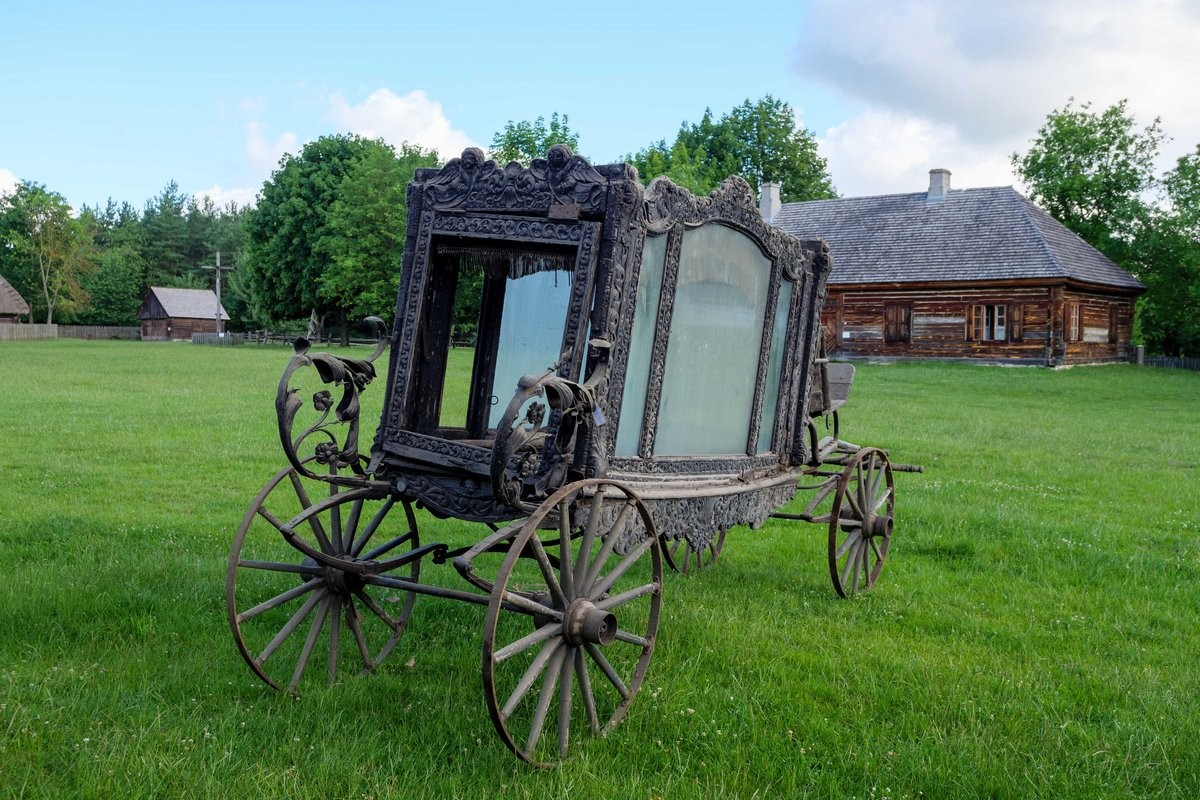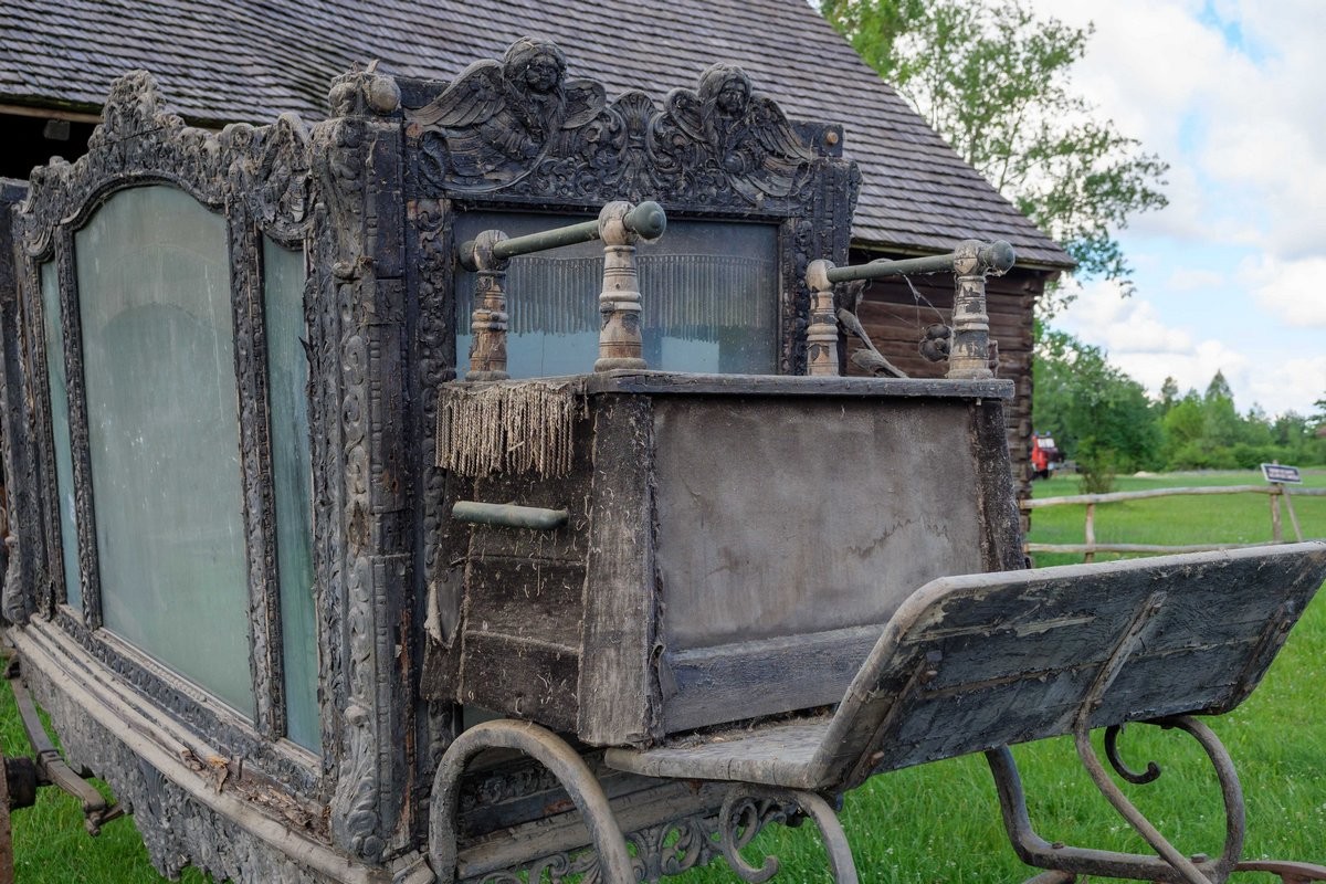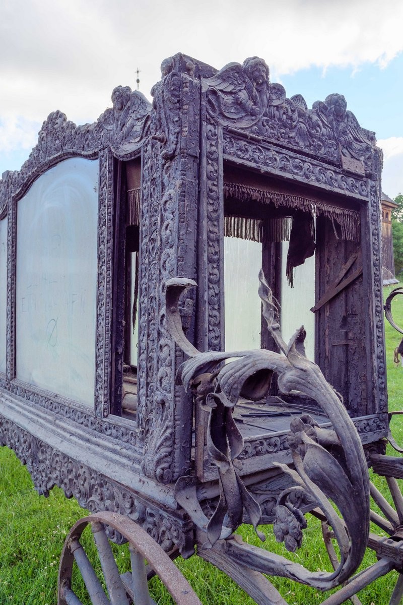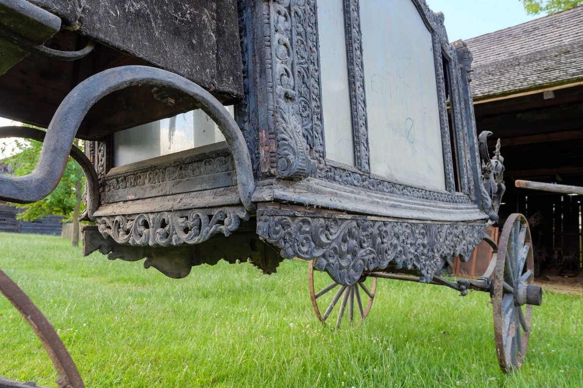 Karawan jest datowany na XIX/XX w. Pogrzebowy pojazd paradny, czterokołowy z bogatą zdobioną dekoracją snycerską. Skrzynia karawanu przeszklona. W dłuższych bokach trójdzielna. Siedzisko woźnicy z dwoma metalowymi podłokietnikami, tapicerowane czarnym aksamitem, zdobione frędzlami. Wewnątrz skrzyni lambrekin z frędzli oraz wykończenia z czarnego aksamitu. Zarówno plecy siedziska od strony woźnicy jak i skrzynia karawanu zwieńczone zdobioną dekoracją snycerską w formie akantowego fryzu oraz przedstawień aniołów na tle roślinnych ornamentów.