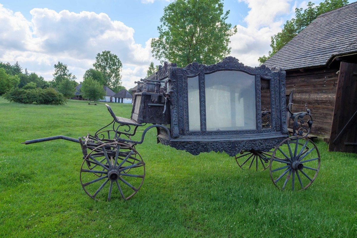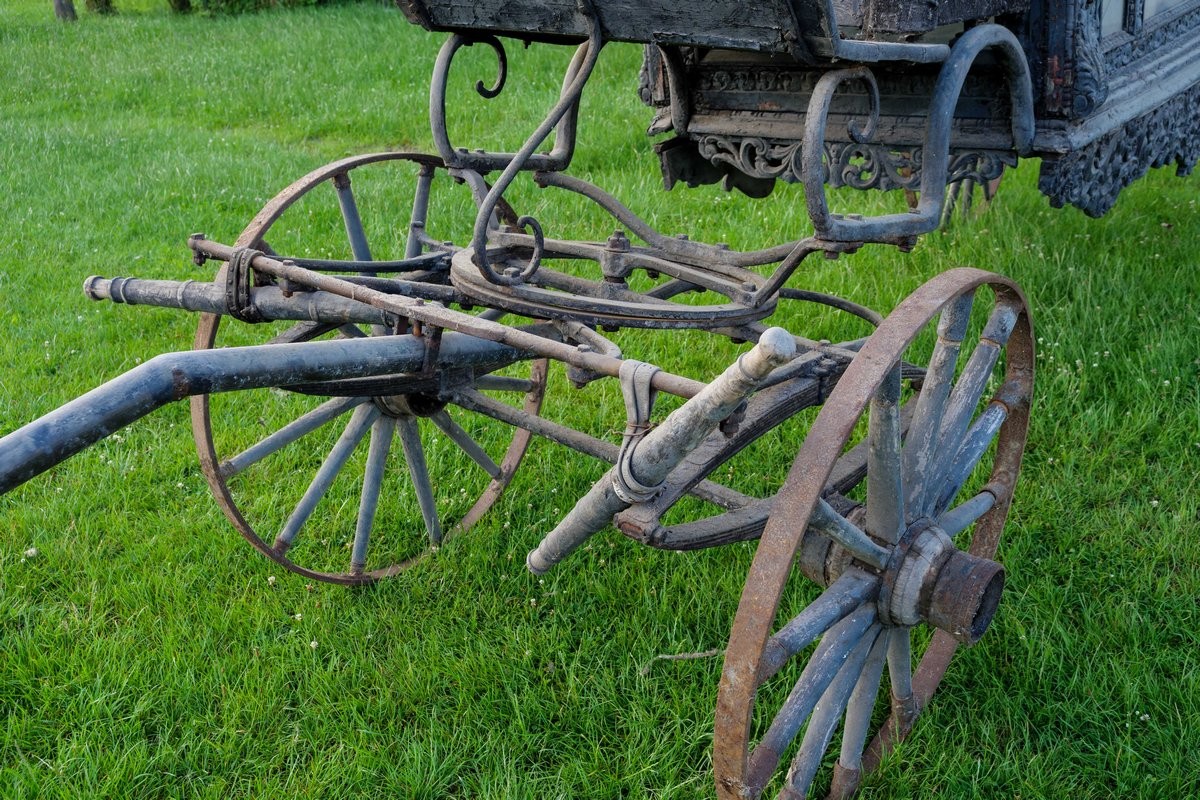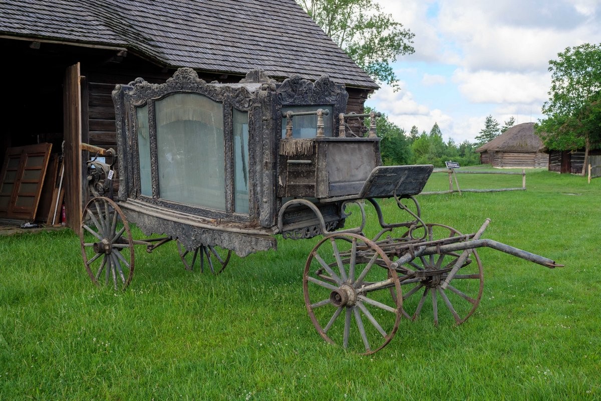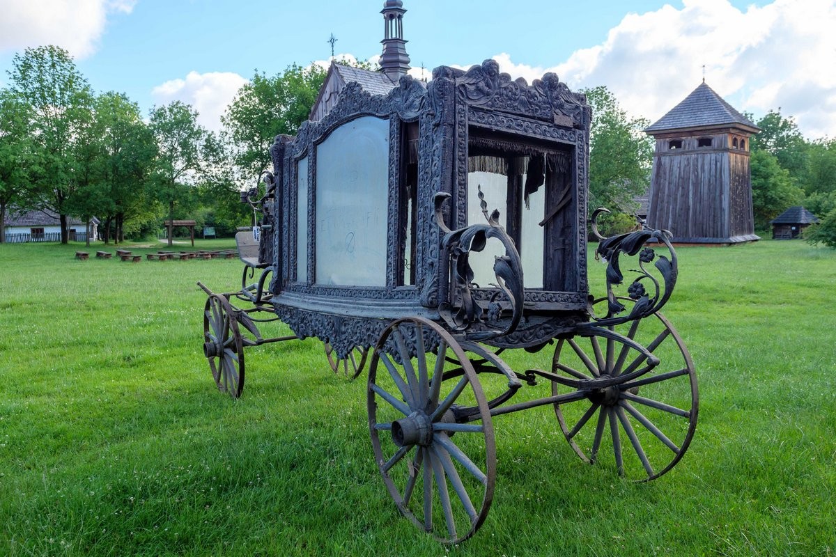 Karawan jest datowany na XIX/XX w. Pogrzebowy pojazd paradny, czterokołowy z bogatą zdobioną dekoracją snycerską. Skrzynia karawanu przeszklona. W dłuższych bokach trójdzielna. Siedzisko woźnicy z dwoma metalowymi podłokietnikami, tapicerowane czarnym aksamitem, zdobione frędzlami. Wewnątrz skrzyni lambrekin z frędzli oraz wykończenia z czarnego aksamitu. Zarówno plecy siedziska od strony woźnicy jak i skrzynia karawanu zwieńczone zdobioną dekoracją snycerską w formie akantowego fryzu oraz przedstawień aniołów na tle roślinnych ornamentów.