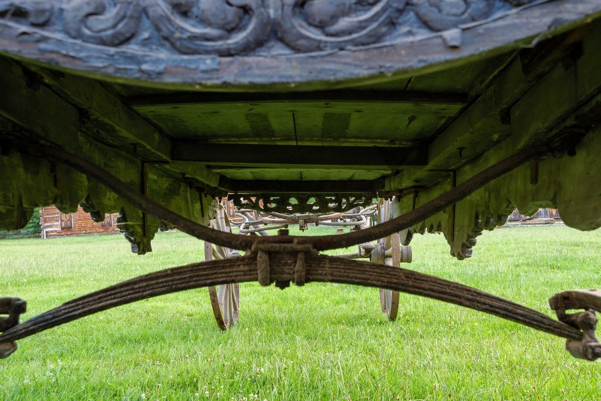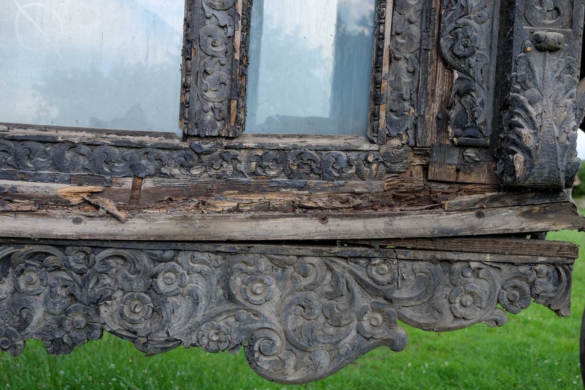 Stan zachowania: Bardzo zły. Powierzchnia silnie zabrudzona z licznymi ubytkami i spękaniami. Miejscowe ślady żerowisk ksylofagów. Warstwa malarska łuszczy się i odspaja. Konstrukcja niestabilna. Obiekt o niestabilnej konstrukcji, uszkodzone koło. Liczne ubytki w dekoracji snycerskiej. Elementy metalowe z ogniskami rdzy. Brak tafli szklanych w części nadwozia. Tkaniny przedarte z ubytkami i przedarciami.