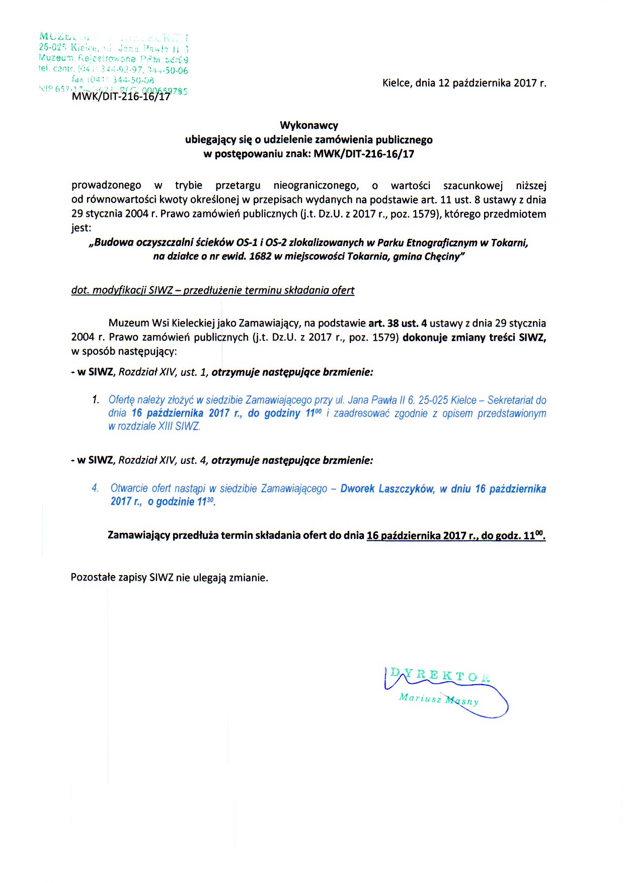 Zamawiający przypomina, iż Wykonawcy, którzy złożyli oferty w przedmiotowym postępowaniu zobowiązani są do złożenia, w terminie 3 dni od daty zamieszczenia ww. Informacji na stronie internetowej Zamawiającego, oświadczenia o przynależności lub braku przynależności do tej samej grupy kapitałowej, o której mowa w art. 24 ust. 1 pkt 23 ustawy z dnia 29 stycznia 2004 r. Prawo zamówień publicznych - forma: oryginał.
